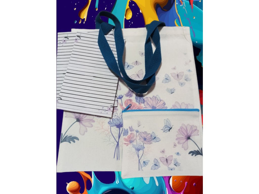 Set obsahuje: 1x látková taška, 1x kosmetická taštička, 2x ručně vyrobený notes.