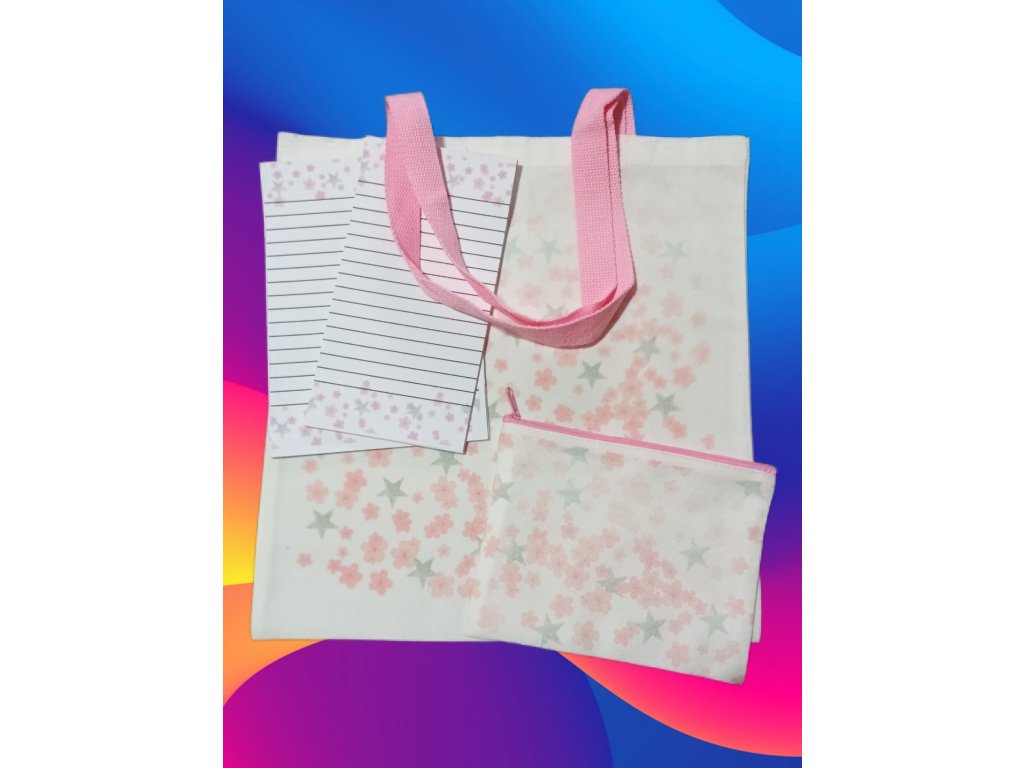 Set obsahuje: 1x látková taška, 1x kosmetická taštička, 2x ručně vyrobený notes.